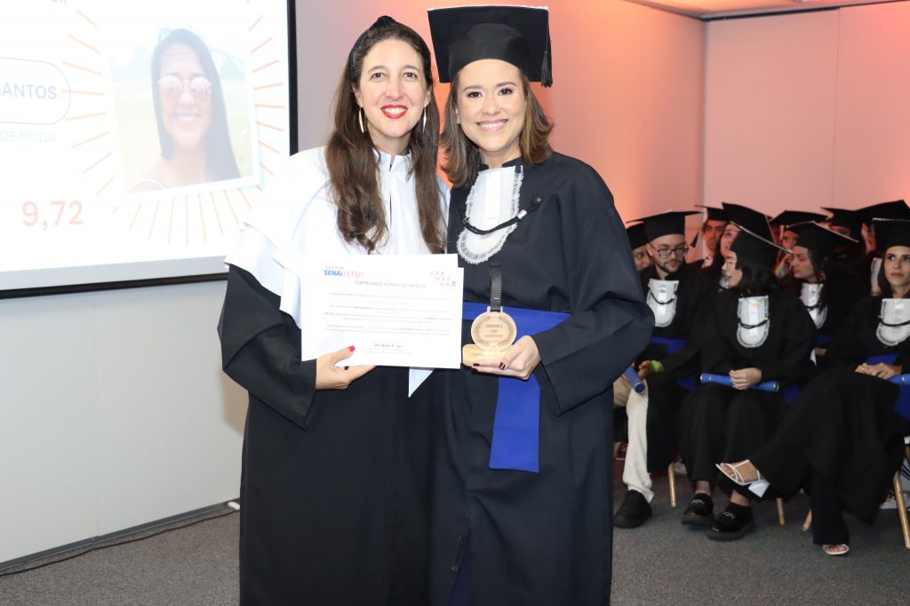 Esse índice reflete a eficácia do modelo educacional adotado pelo SENAI CETIQT, que se distingue pela conexão entre teoria e prática. Desde o início do curso, os alunos são expostos ao desenvolvimento de habilidades práticas e voltadas para as necessidades reais da indústria, facilitando sua inserção no mercado – fato que foi evidenciado no discurso de Waleska Costa Santos, aluna do curso de Design de Moda que recebeu o Certificado de Honra ao Mérito: