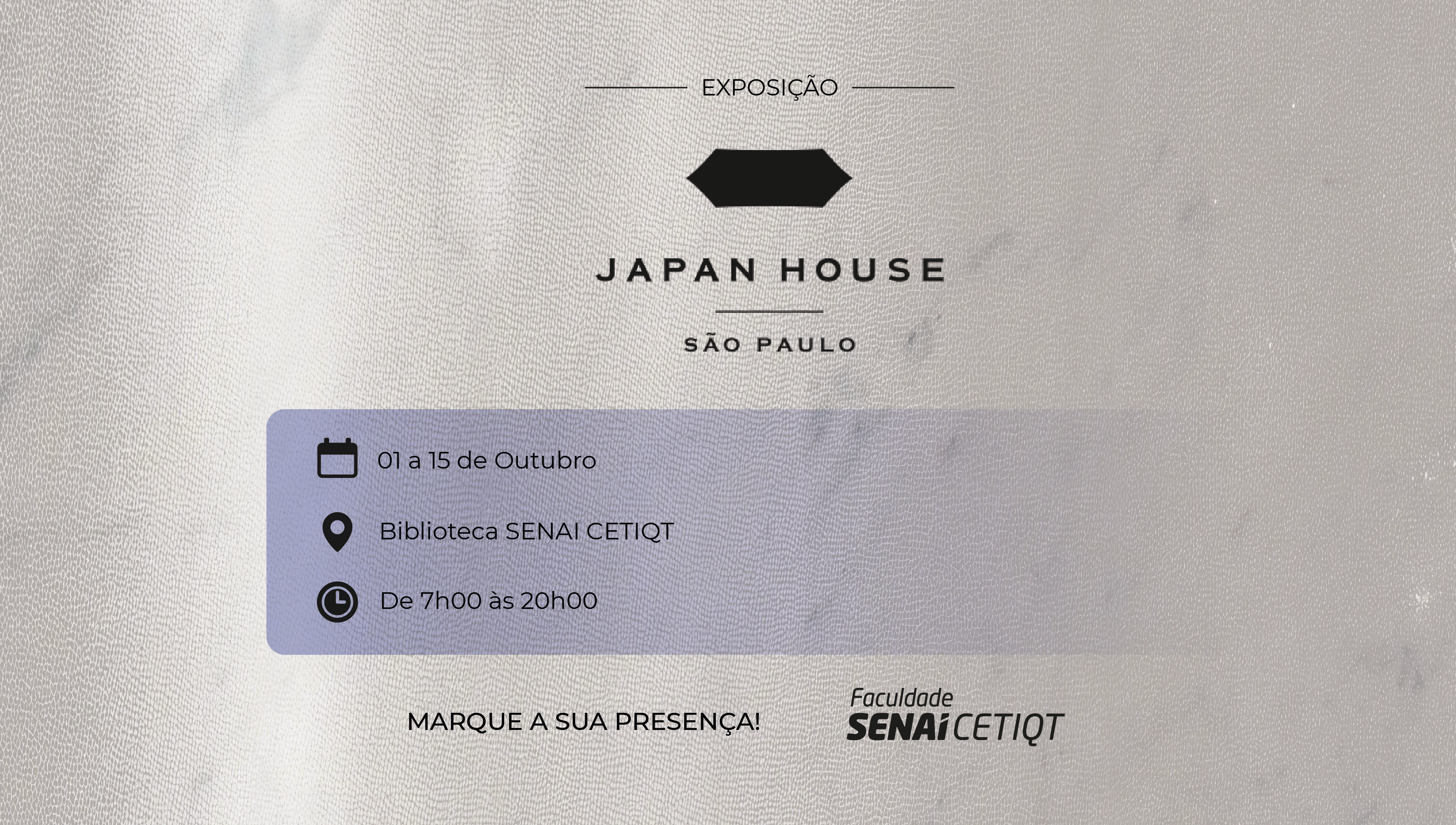 Com o objetivo de ampliar o repertório cultural de alunos, professores e colaboradores, a Biblioteca SENAI CETIQT apresenta, até o dia 15 de outubro, a exposição de fotos Japan House, aberta das 7h às 20h, de segunda a sexta-feira.